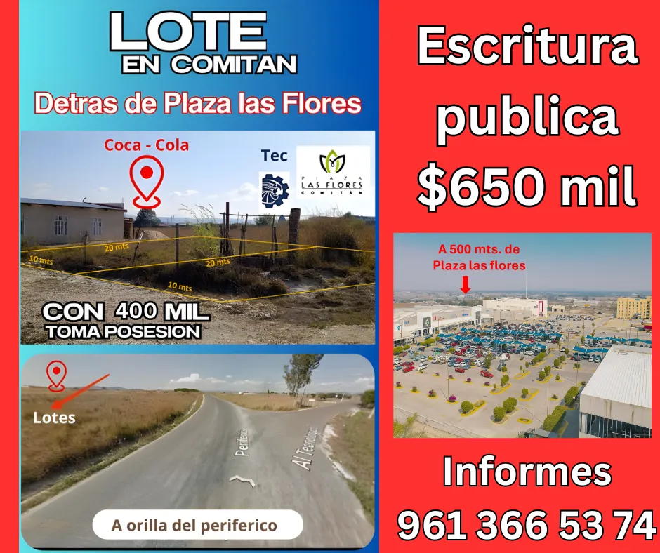 Y tengo un lote 10*20 con escritura pública y predial, en zona comercial de Comitán, si te interesa o sabes de alguen que le pueda interesar, seria oxígeno para mi situación, podemos tratar. Esta a orilla del periferico, enfrente cuenta con area verde para maniobras de trailer, camion, ideal para bodega, locales, casa habitacion, o lo que sea, excelente ubicación.